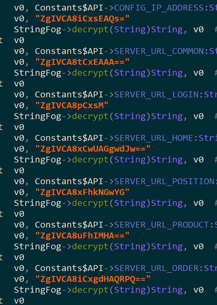 The Android apps we found used a slightly different approach to making web apps look like native ones. They have a server URL coded into the app and use a WebView to display the pag4 at this embedded URL. The URL and some of the other important strings in the Android apps are encoded using an opensource project called StringFrog, which uses a combination of base64 and xor with a hardcoded key.