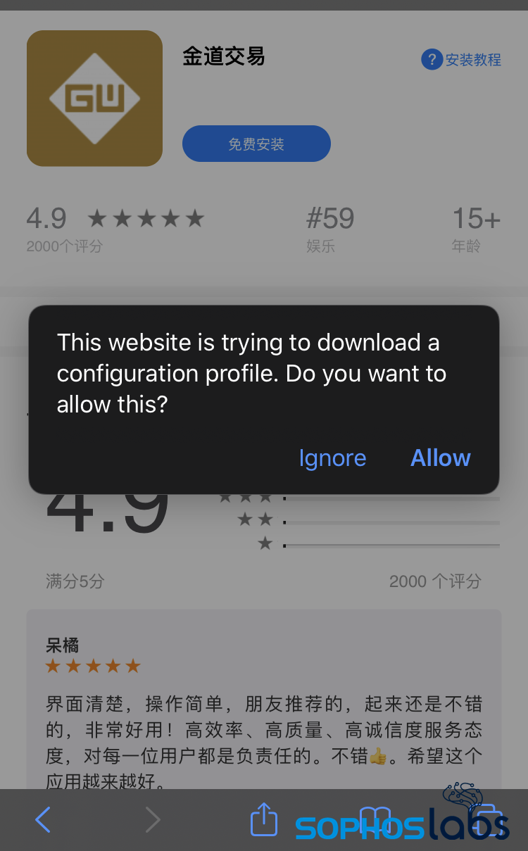If the targeted user decides to download the iOS app, the click takes them to a web page that mimics the iOS app store and attempts to download mobile device management configuration file. The page even has fake reviews to help convince the target that the application is legitimate.