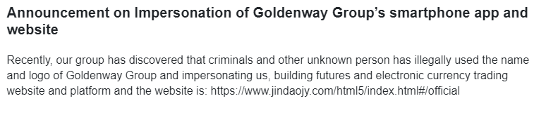 Goldenway is aware of these sorts of scams. A warning on the company’s actual website opens with an alert about fraudsters scamming users with a similar named site and asks its users to steer clear of such apps.