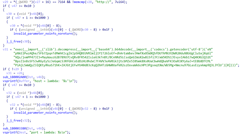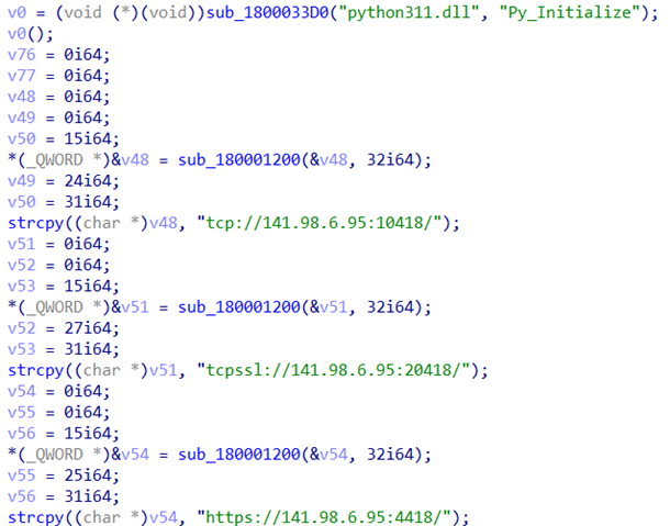 We observed multiple variations of the NitrogenStager file (python310.dll), and in some samples, string constants such as the C2 addresses are clearly visible in the code: