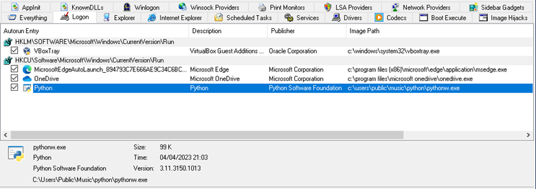 The NitrogenInstaller DLL then creates a registry run key to establish persistence; this key is named “Python” (HKEY_USERS\<User SID>\Software\Microsoft\Windows\CurrentVersion\Run\Python). We also observe a related scheduled task named “OneDrive Security” pointing to the binary C:\Users\Public\Music\python\pythonw.exe, which has an execution interval of five minutes.