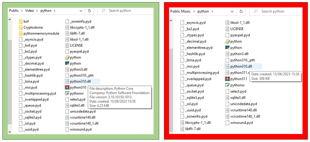 Figure 11: On the left (green border), the BeaconPack version of the application contains the original, larger python310.dll with legitimate version information; on the right (red border), the malicious version is smaller and has no version number, file description, or company data