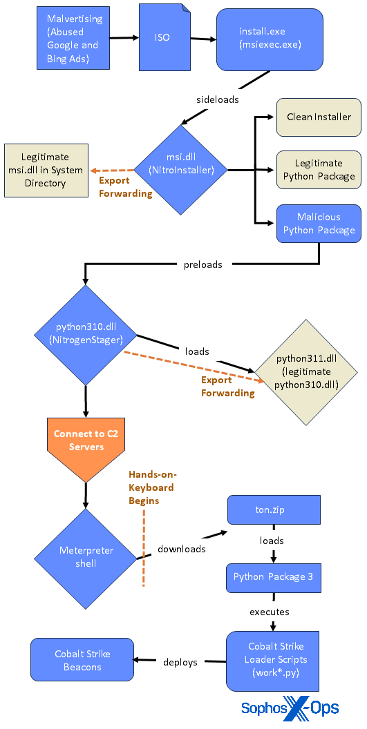 When downloaded, the installers sideload the malicious NitrogenInstaller DLL containing a legitimate software application bundled with a malicious Python execution environment. The Python package uses Dynamic Link Library (DLL) preloading to execute the malicious NitrogenStager file, which connects to the threat actor’s command-and-control (C2) servers to drop both a Meterpreter shell and Cobalt Strike Beacons onto the targeted system. Throughout the infection chain, the threat actors use uncommon export forwarding and DLL preloading techniques to mask their malicious activity and hinder analysis.