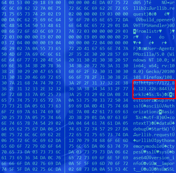 Once the work*.py scripts load, they execute a compiled object, which contains the URL of the next stage; for example, the script work3.py downloads the file work3 from the same server. The downloaded work3 file is a Cobalt Strike Beacon.