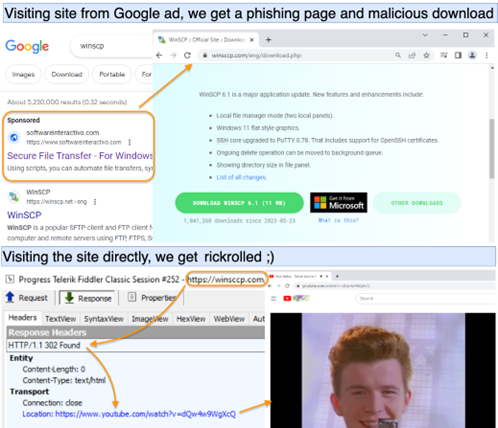 Notably, if a user or researcher tries to directly visit the site winsccp[.]com by typing in the URL instead of going through the ad, it redirects to a YouTube video of Rick Astley’s classic “Never Gonna Give You Up” – effectively rick-rolling researchers. We assess the phishing site is likely inspecting referrer headers to confirm the user has arrived there via a search engine, which is a tactic commonly observed in malvertising campaigns.