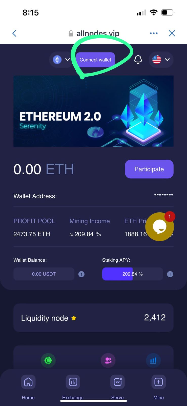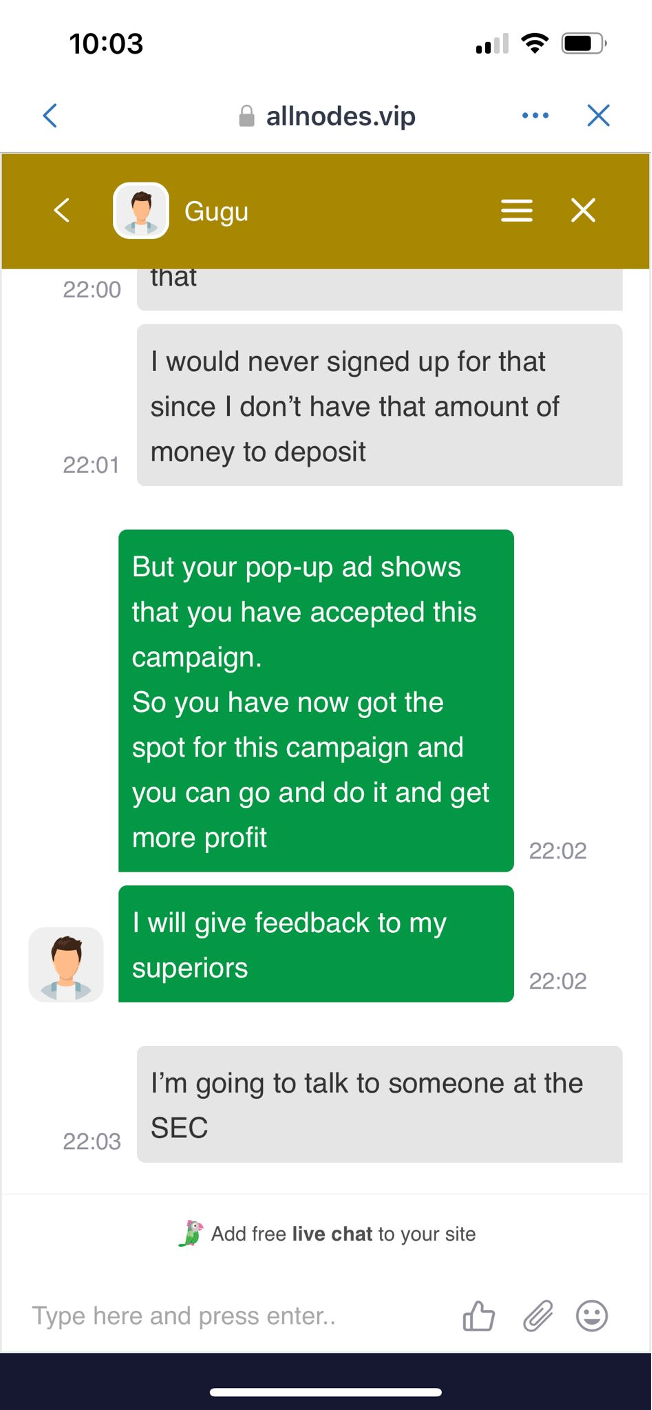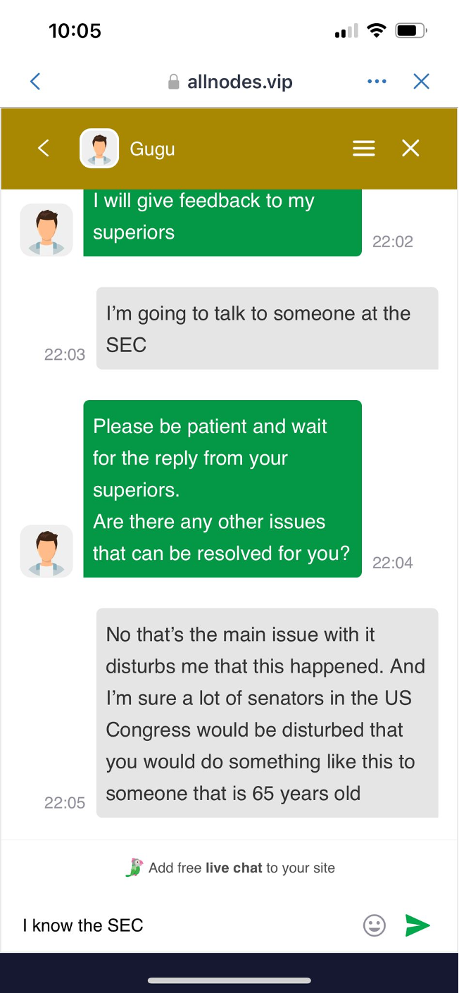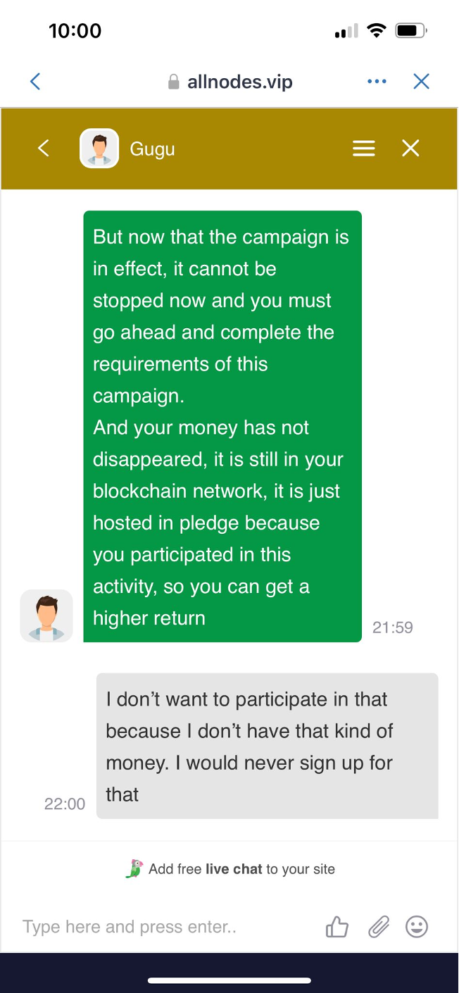 Frantic to recover his investment, Frank contacted the “technical support” for the scam site, believing he was contacting Trust Wallet support through an in-app chat. But he was actually connecting to the scam team through a chat app on the allnodes[.]vip website that Frank had opened from within Trust Wallet.
