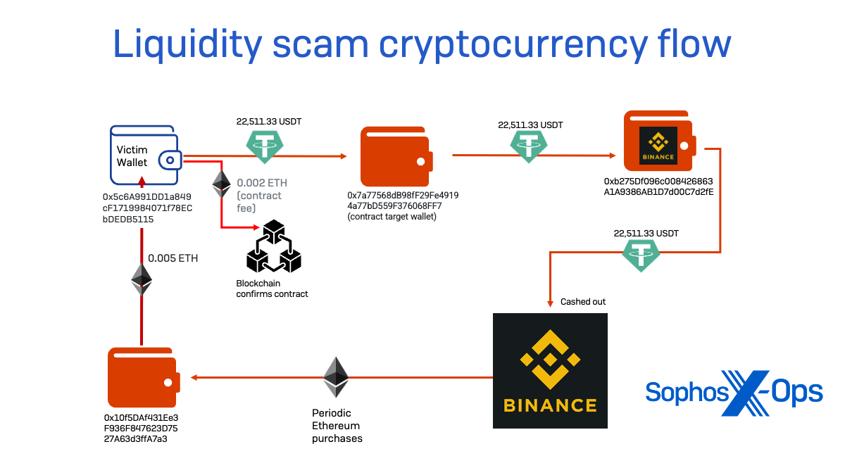 The wallet that “lent” the victim the Ethereum (ETH) required to pay the “gas” for the contract (0x10f5DAf431Ee3F936F847623D7527A63d3ffA7a3) received the cryptocurrency from the Binance exchange, and had distributed ETH to other addresses to create similar contracts linking to other fraudulent pools. (Details of these will be presented in a future Sophos X-Ops report.)