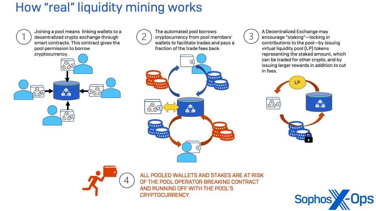 Liquidity mining scams leverage the complexity of decentralized finance (DeFi) cryptocurrency trading applications, such as decentralized exchanges (DEXs) and Automated Market Makers (AMMs), to confuse and defraud. These scams promise regular income at high rates of return for investment in a “liquidity pool” that loan cryptocurrency to make contract-based trades between different cryptocurrencies possible.