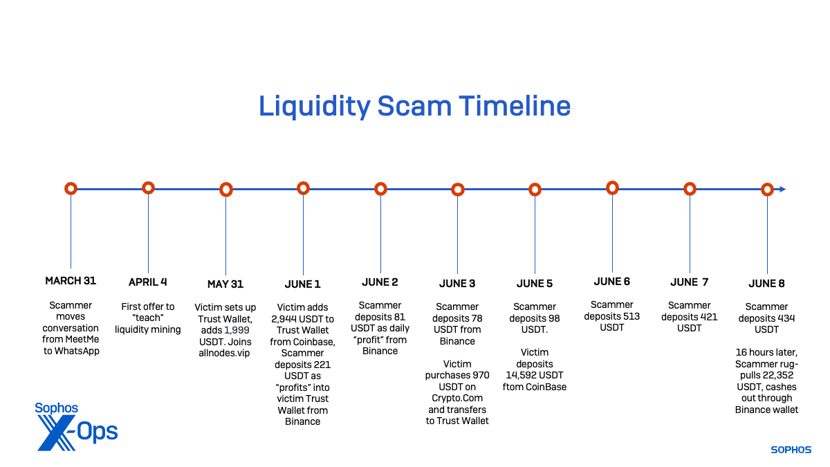 Crypto fraud has become the dominant form of Internet-based confidence schemes over the past three years, as demonstrated by the sha zhu pan (“pig butchering”) scams we recently investigated. But one variant has been growing at a particularly rapid pace: fake “liquidity mining.” Sophos X-Ops has also seen growth in crypto phishing sites that connect to cryptocurrency wallets while impersonating cryptotrading-related brands in other types of scams, but these sites are often used by sha zhu pan scammers to separate victims from their money.