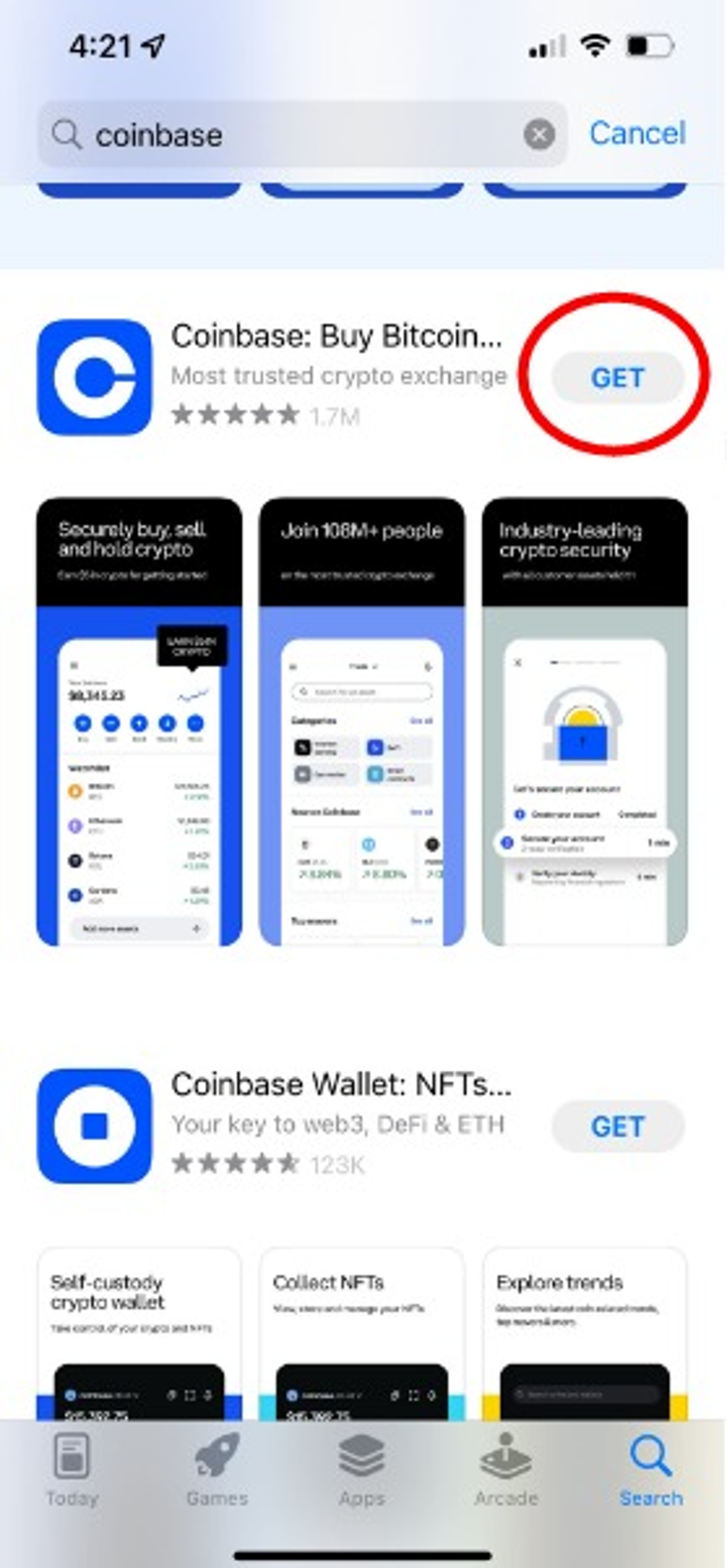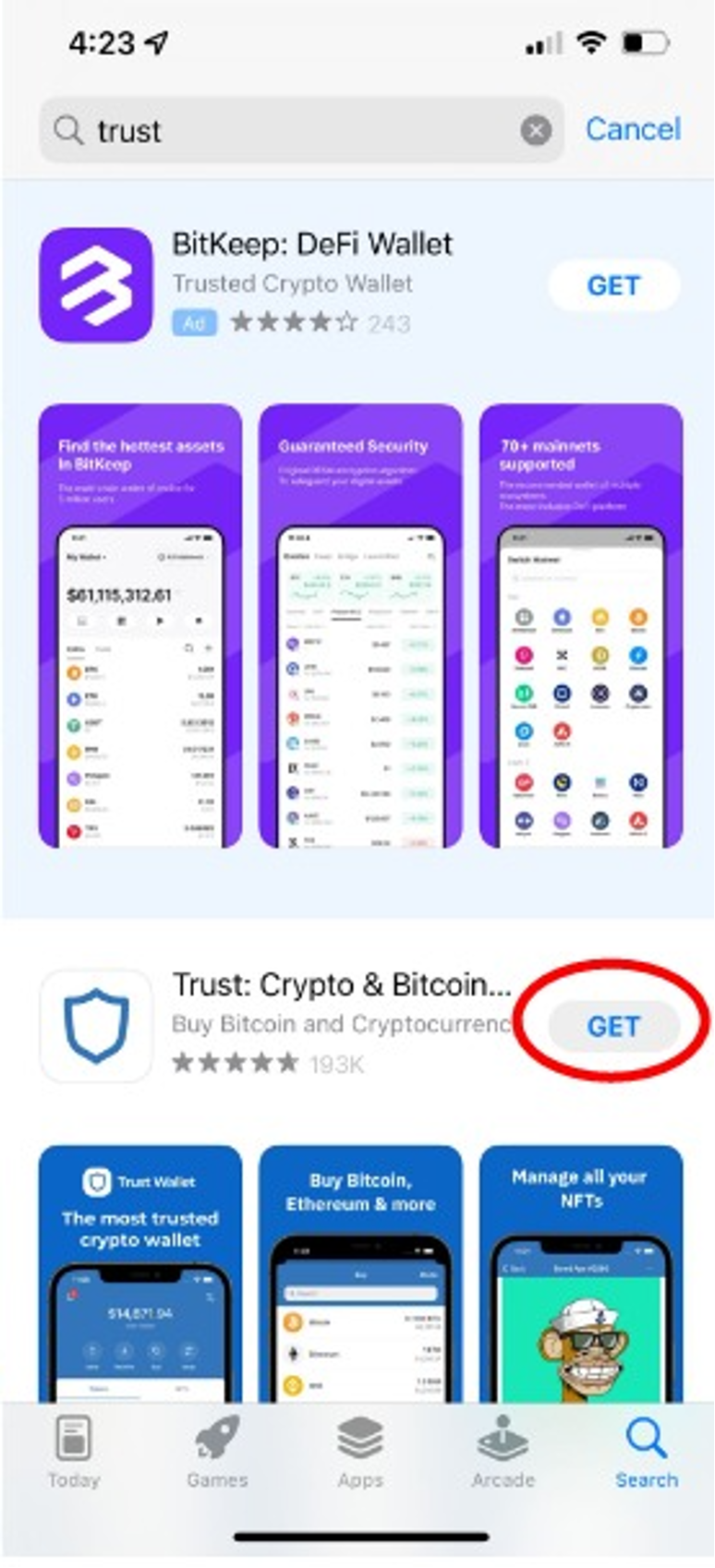 Frank was highly resistant to this line of conversation, being averse to anything having to do with cryptocurrency. The scammers persisted, telling Frank that there was no risk, and that the cryptocurrency he put in his wallet would stay there. Finally, on May 1—more than a month after initial contact—they managed to convince Frank to install wallet apps on his phone. Using annotated screenshots, they walked him step by step through the process of installing the legitimate and widely trusted and used apps TrustWallet and Coinbase:
