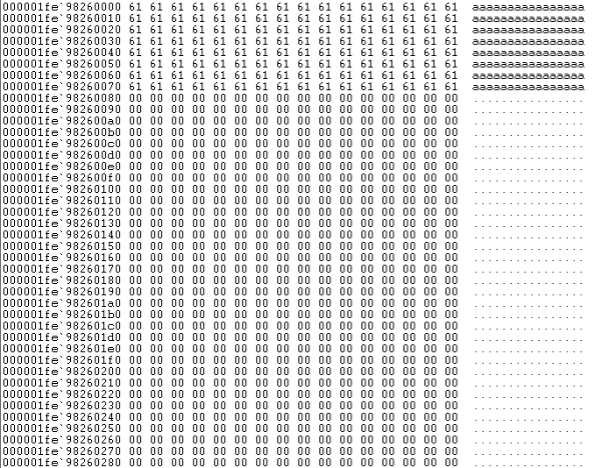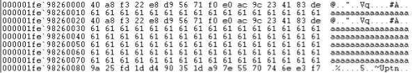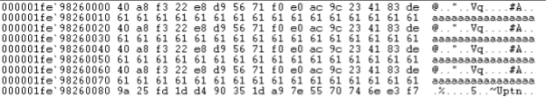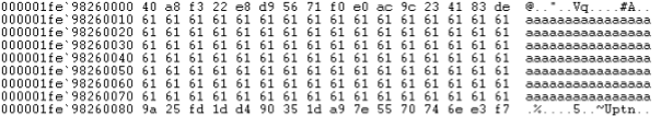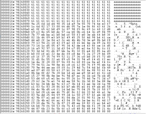 The code continues by appending the decryption blob to the end of the document in memory. Here is an example of a test document comprising the character ‘a’ (0x61), 128 times: