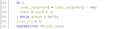 Then a string is decoded, which is a parameter for the system() call at line 161.