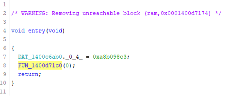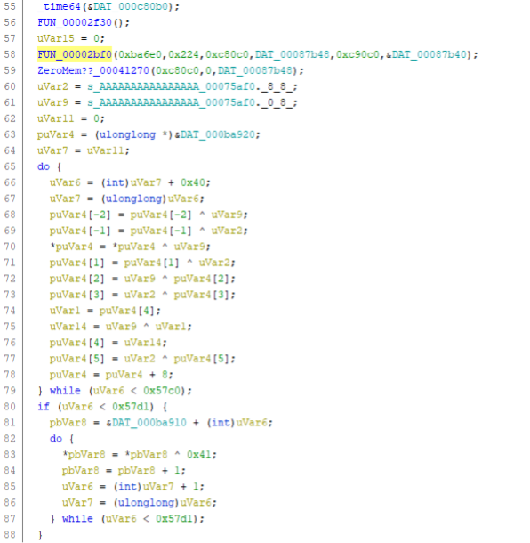 Because the rest of the code is unpacked in the OPEN section, i.e., it is runtime generated, we used WinDbg and .writemem to write the OPEN section to disk, so we can analyze the code statically in Ghidra, e.g.: