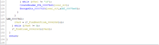 The ransomware uses FindFirstFile() at line 63 and FindNextFile() at line 129 to iterate through the directory in param_1.