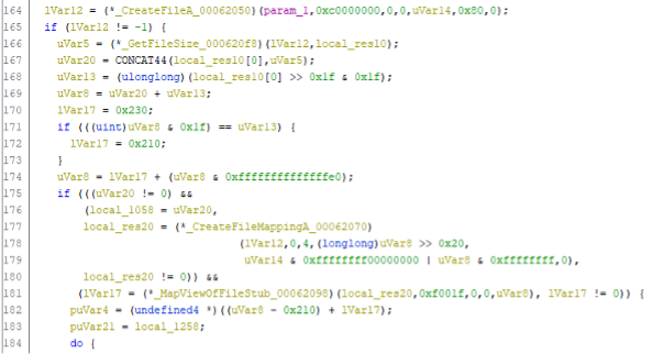 The document is first opened at line 164 and at line 177 the function CreateFileMapping() maps the document into memory. At line 181, lVar17 points to the now memory mapped document.