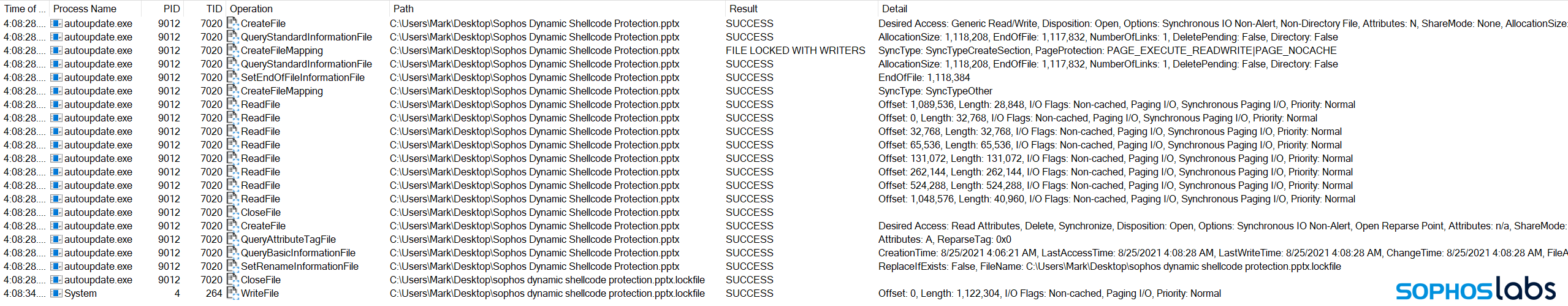 Since the attack leverages CreateFileMapping(), the encrypted memory mapped document is written (persisted) to disk by the Windows System process, PID 4. This can be witnessed via Sysinternals Process Monitor. In the figure below we removed the Process Monitor filter that excludes activity by the System process (PID 4):