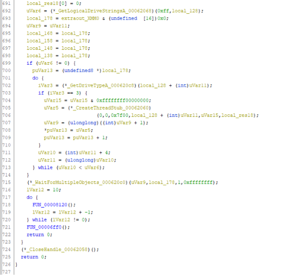 In the loop, it determines the drive type via GetDriveType(). When this is a fixed disk (type three = DRIVE_FIXED at line 703), it spawns a new thread (at lines 705, 706), with the function 0x7f00 as the start address.