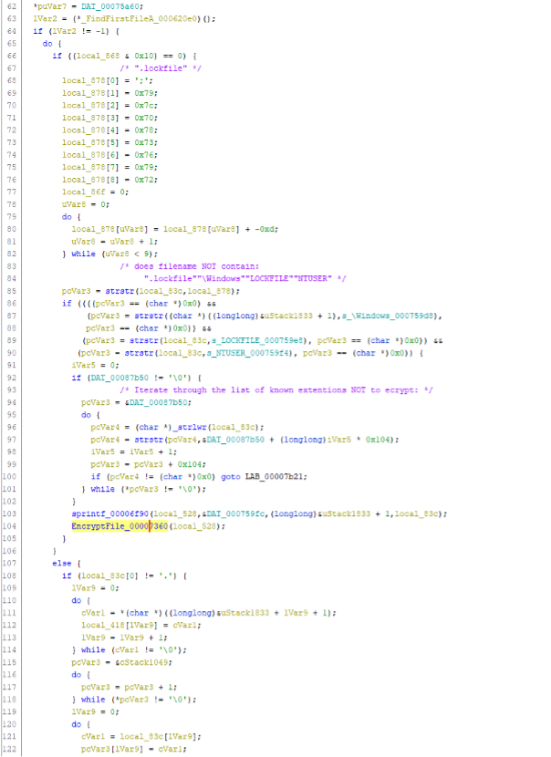 If the file extension of a found document is not on the list, the code concatenates the filename and path (line 103) and calls EncryptFile_00007360() to encrypt the document.
