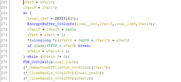 Further on, the document gets encrypted, 16 bytes at the time, via function EncryptBuffer_0002cbf4() at line 271: