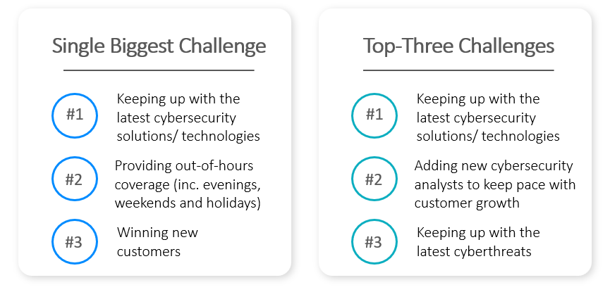 The survey revealed that the biggest day-to-day challenge facing MSPs is keeping up with the latest cybersecurity solutions/technologies, cited by 39% of those surveyed. MSPs also indicated that hiring new cybersecurity analysts to keep up with customer growth and keeping pace with the latest cyberthreats are among their top challenges.