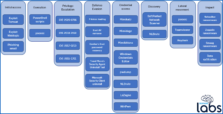 Sopra, tratto dal rapporto SophosLabs, c’è un grafico che mostra la gamma di strumenti utilizzati da questi truffatori durante un tipico attacco.