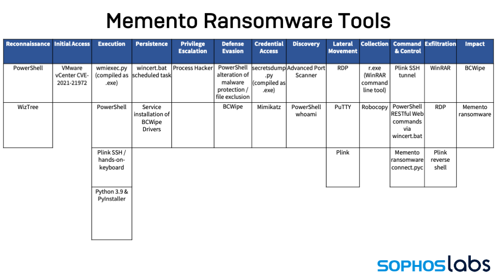 Correction: This report originally noted the deployment of SOTI remote control software as part of the ransomware attack. Further analysis revealed this was an unrelated remote control software deployment by an administrator that had not been shared with Sophos’ Rapid Response team.
