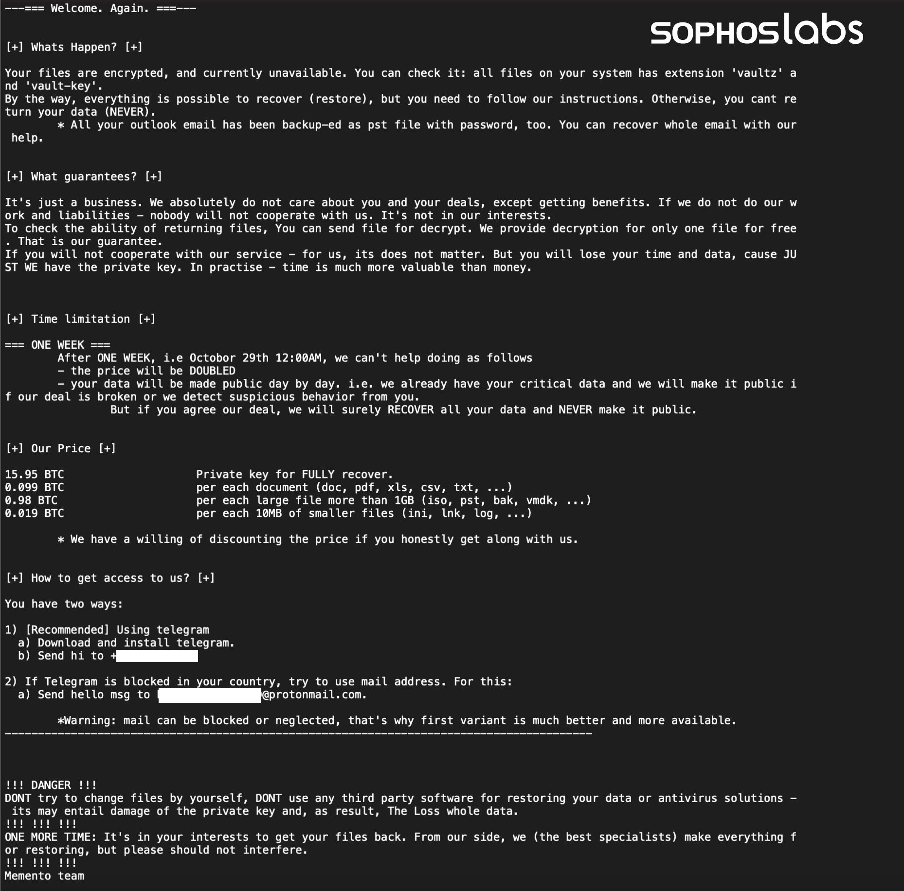 The Memento ransom note. The Telegram number was a phone number with a Los Angeles area code, likely registered through a VoIP service.