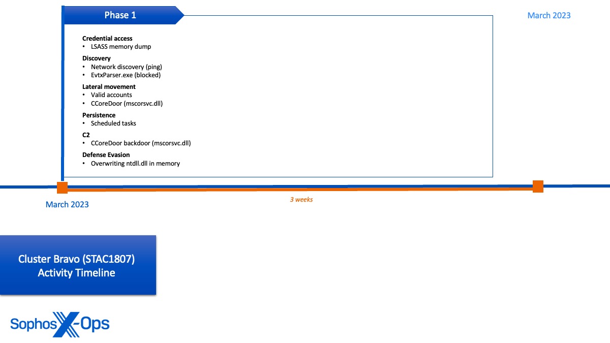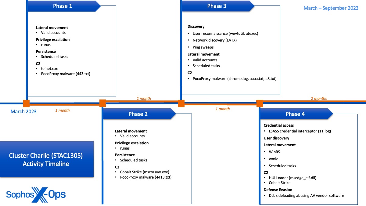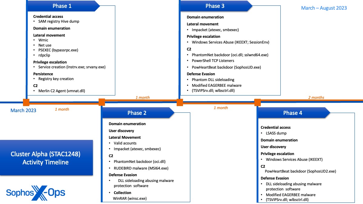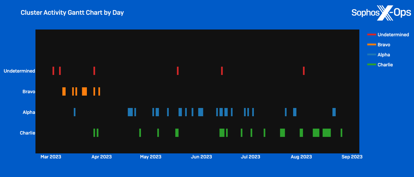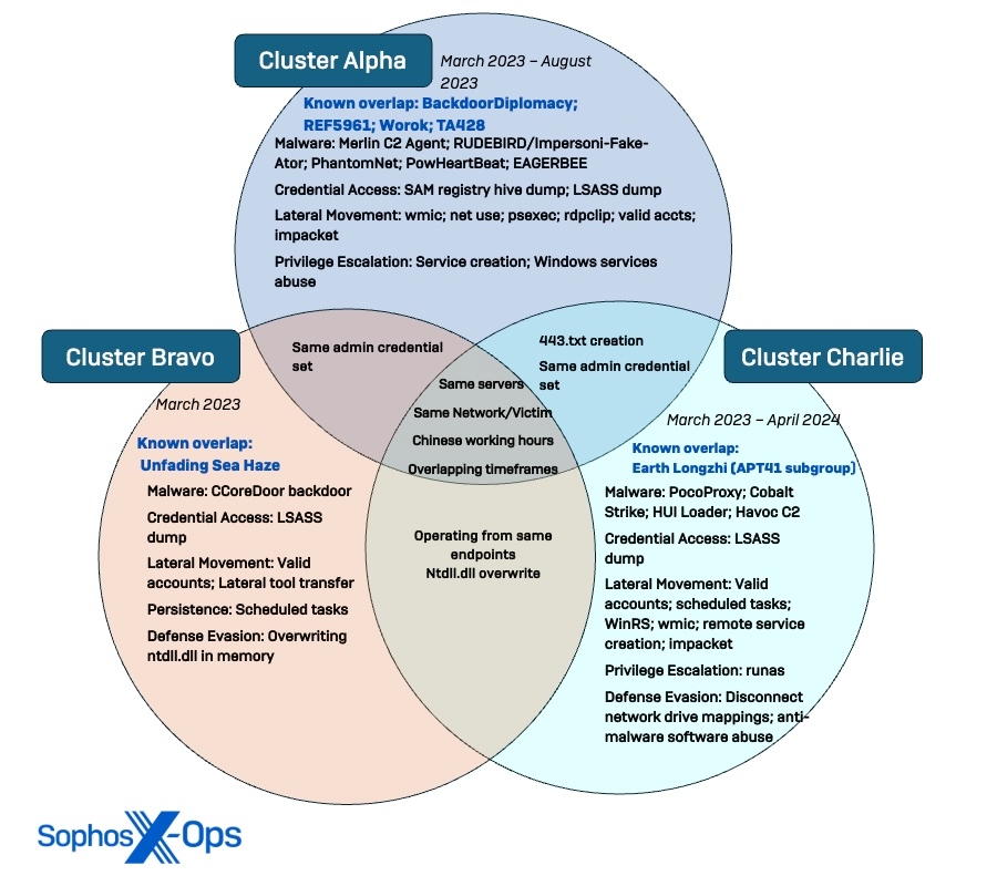 - Three distinct clusters with overlaps indicating coordination: While Sophos identified three distinct patterns of behavior, the timing of operations and overlaps in compromised infrastructure and objectives suggest at least some level of awareness and/or coordination between the clusters in the environment.