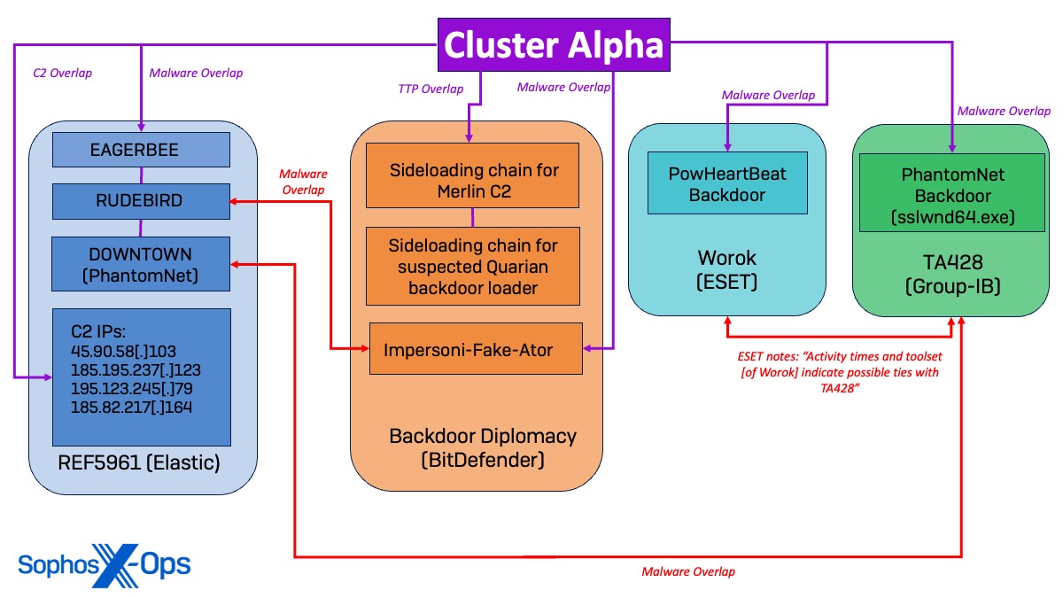 Cluster Alpha activity also aligns with a case study by BitDefender on a cyberespionage campaign in the Middle East by a Chinese threat actor tracked as BackdoorDiplomacy, which is noted to overlap with other reported threat groups such as APT15, Playful Taurus, Vixen Panda, NICKEL, and Ke3chang.