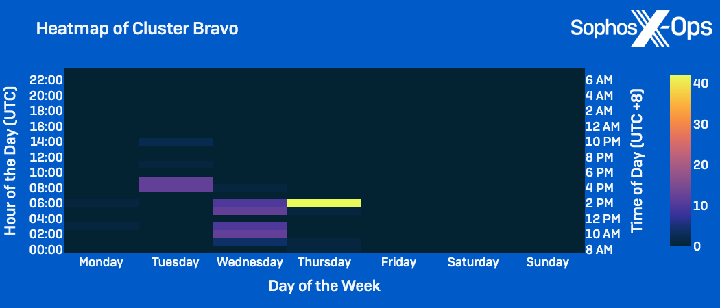 - Cluster Bravo activity: Occurred within traditional working hours of 8am to 5pm CST, but was concentrated on Tuesday, Wednesday, and Thursday.