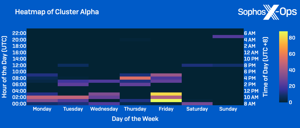 - Cluster Alpha activity: Often occurred on weekdays within the traditional working hours of 8am to 5pm CST; Peaked on Friday.