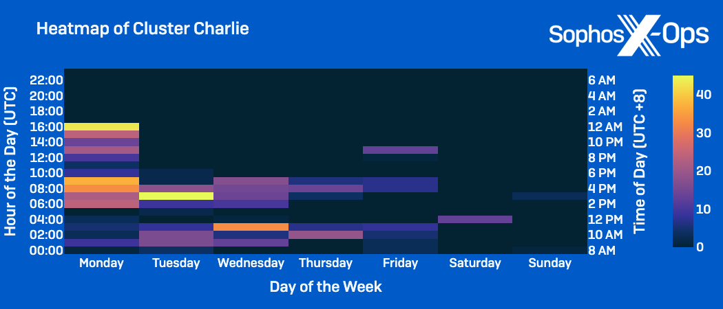 - Cluster Charlie activity: Varied the most outside standard working hours; Activity peaked Monday through Wednesday 12pm to 6pm CST.