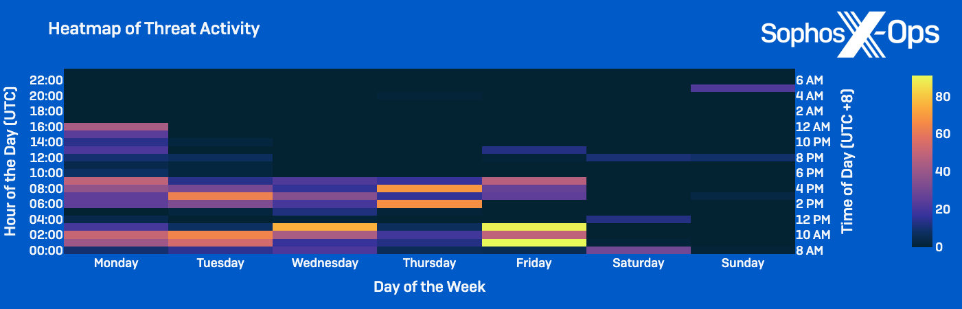According to our analysis of activity frequency, activity in the clusters primarily occurred between 00:00 and 09:00 Coordinated Universal Time (UTC) Monday through Friday, equal to typical Chinese working hours of 8am to 5pm China Standard Time (CST).