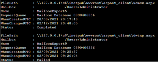 • Get-MailboxExportRequest | Select-Object -Property FilePath,Mailbox,Name,RequestQueue,WhenCreatedUTC,WhenChangedUTC,Status