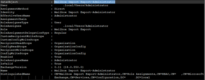 • Get-ManagementRoleAssignment -Role “Mailbox Import Export” | Select-Object -Property Name,Role,RoleAssigneeName,WhenCreated