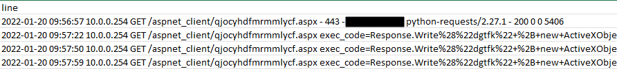 If you don’t get any results, make sure you check the other log files and other .aspx file names you have seen. If you do get results, they may look similar to the below and while they can be read by humans, this may be difficult at first glance.