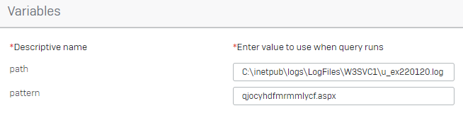 If an attacker gained the ability to execute commands remotely on the server, one of the first places these might show up is in the Internet Information Services (IIS) logs. You can identify the location and name of these logs by using this query: