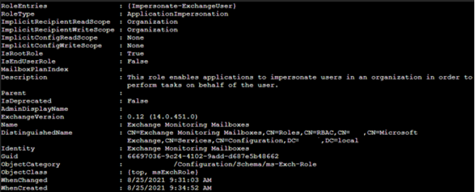 • Get-ManagementRoleAssignment -Role “ApplicationImpersonation” | Select-Object -Property Name,Role,RoleAssigneeName,WhenCreated