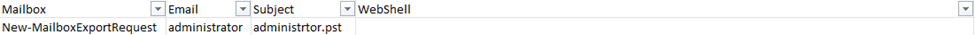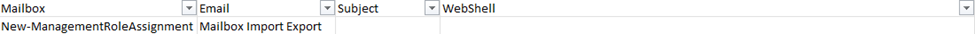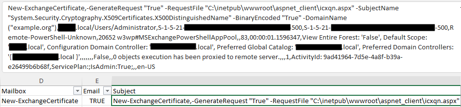 Run this query on the Exchange servers and investigate the results. One event that you should look for first is “New-MailboxExportRequest.” Suspicious cases will often have a random subject name and point to an “.aspx” file. Those .aspx files are the web shell.