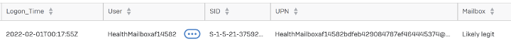 If the events have been logged, legitimate HealthMailboxes include a 32-character string at the end of their name. Malicious HealthMailboxes have only been seen with a 7-character string. Any logon events that show a UPN field (not username) that is the short version should be further investigated. This information can be gathered through Live Discover:
