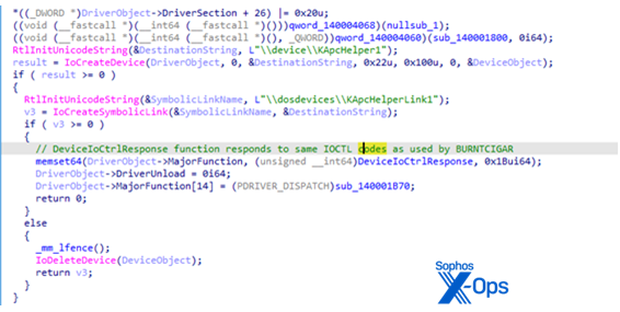 In this screenshot of decompiled driver code, taken from the later driver signed by Zhuhai Liancheng Technology Co. Ltd., the routine creates the device \\device\\KApcHelper1 and symbolically links it to \\dosdevices\\KApcHelperLink1, the same symbolic link name used by the BURNTCIGAR variant in the incident we investigated to communicate with the driver.