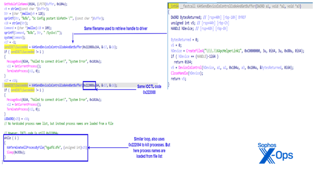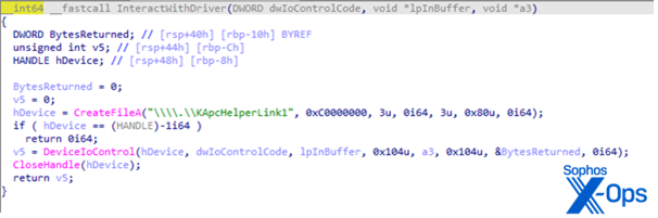 The driver and the loader interact by accessing a symbolic link named “\\\\.\\KApcHelperLink1”. The program contains at least two hardcoded IOCTL codes, 0x222088 and 0x222094, used to interact with the driver. The loader uses IOCTL code 0x222094 to pass the process name, and signal the driver to kill a process.