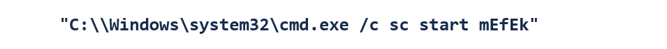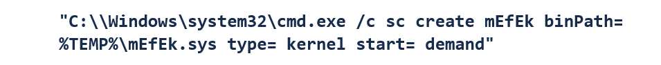 When executed, the loader copies the driver to %temp%, giving it a five- to seven-character filename, then creates a service entry for the driver (in this instance, named mEfEk.sys) by executing a command: