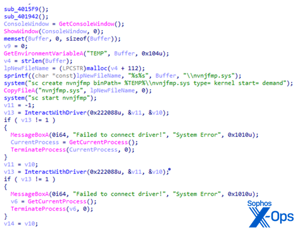In our post-attack analysis, SophosLabs determined that the pair of executable files — a cryptographically signed Windows driver (signed with a legitimate signing certificate) and an executable “loader” application designed to install the driver — were used in tandem in a failed attempt to disable endpoint security tools on the targeted machines.