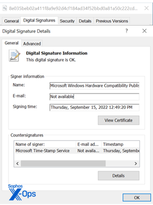 In incidents investigated by Sophos, threat actors tied to Cuba ransomware used the BURNTCIGAR loader utility to install a malicious driver signed using Microsoft’s certificate. The signature data embedded in those signed drivers shared the following common characteristics: