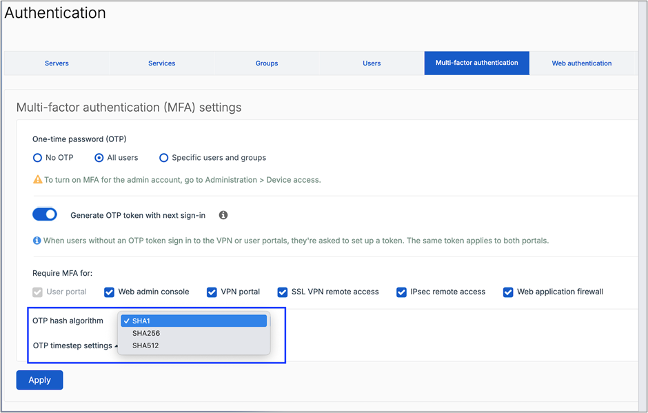 La compatibilidad con SHA 256 y 512 para tokens OTP ha sido una solicitud muy popular entre nuestros clientes de SG UTM y ahora es una opción en Sophos Firewall para Google y las aplicaciones de Sophos, así como para los usuarios administradores.