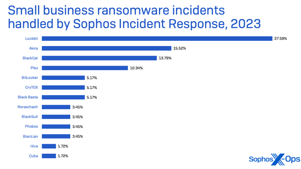 Figure 7 : Une répartition des auteurs de ransomware à l’origine des incidents ayant ciblé les petites entreprises et que Sophos Incident Response a investigués en 2023 ; ces chiffres reflètent le Dataset des interventions manuelles menées par l’équipe IR chez les clients qui n’avaient généralement pas mis en place de protections Sophos auparavant.