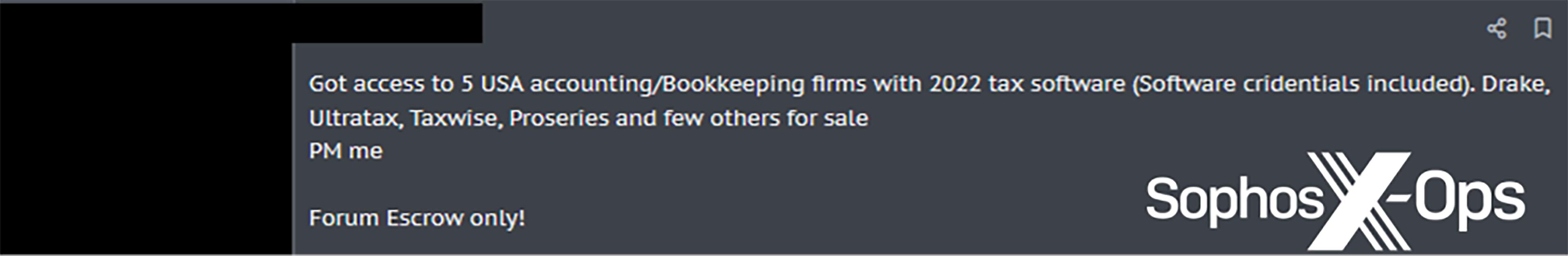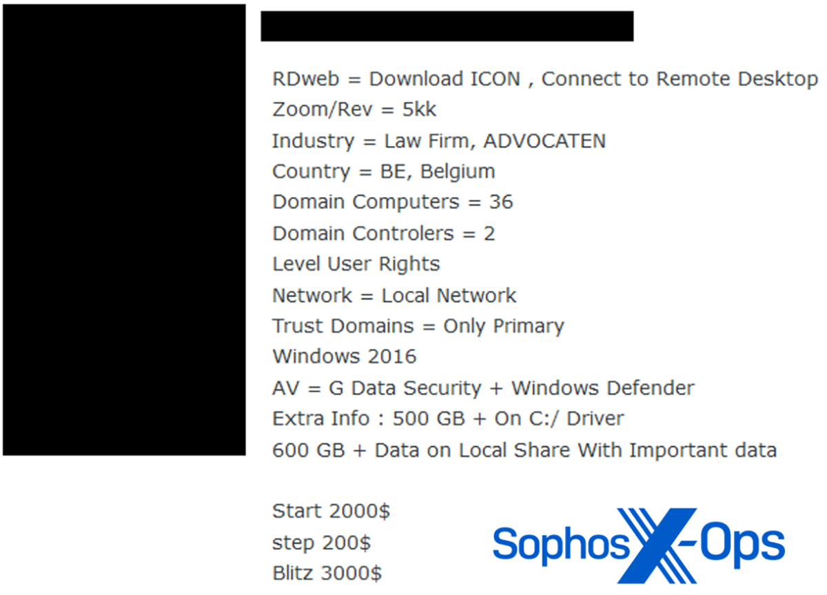 Les identifiants volés, notamment les cookies de navigateur, peuvent être utilisés pour compromettre la messagerie professionnelle, accéder à des services tiers tels que des systèmes financiers basés dans le Cloud et accéder à des ressources internes qui peuvent être exploitées à des fins de fraude ou pour générer divers gains financiers. Ils peuvent également être vendus par des “courtiers d’accès (access brokers)” à quiconque souhaiterait les exploiter ; Sophos a repéré des offres sur des forums underground prétendant donner accès à un certain nombre de réseaux de petites et moyennes entreprises.
