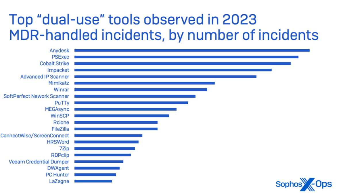 AnyDesk et PsExec ont tous deux été vus dans plus d’incidents par Sophos MDR que Cobalt Strike, comme indiqué ci-dessous :
