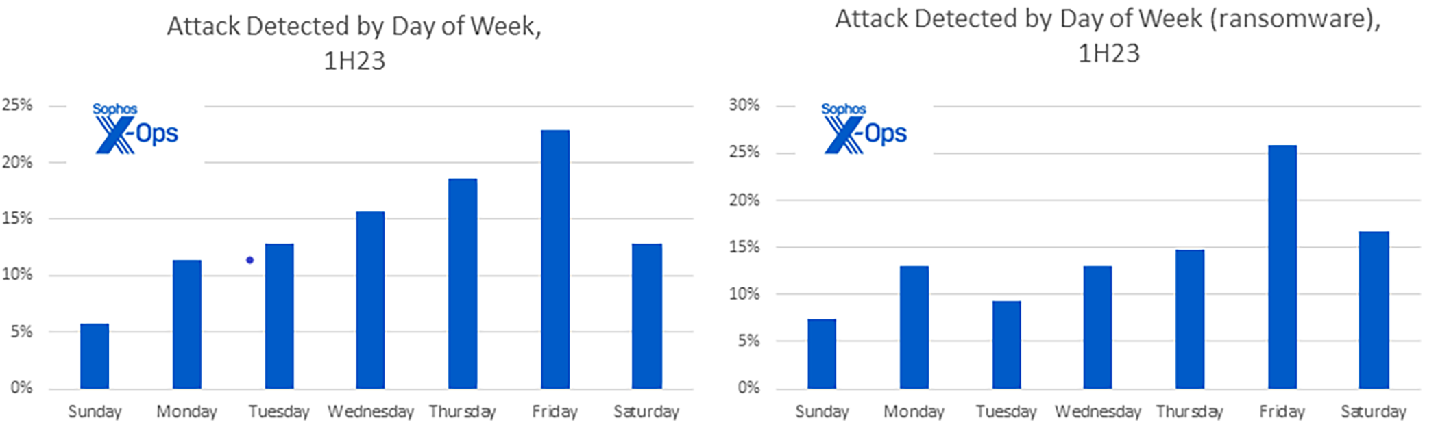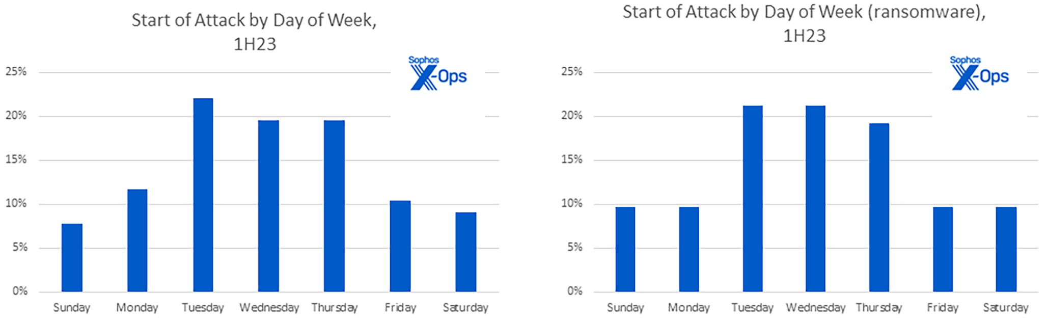 Figure 4 : Les gangs de ransomware ont a priori une préférence pour attaquer en fin de semaine, compliquant ainsi souvent les efforts nécessaires pour joindre non seulement les équipes techniques mais aussi les dirigeants de l’entreprise. Nous attribuons à ces résultat un niveau de confiance moyen, car il est fort probable qu’une partie des cas que nous avons observés aient été détectés en interne plus tôt dans la semaine mais n’aient été révélés aux experts X-Ops en réponse aux incidents que bien plus tard.